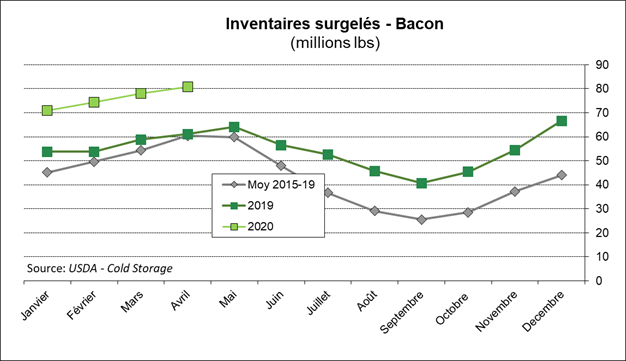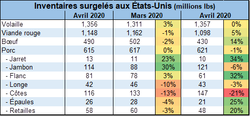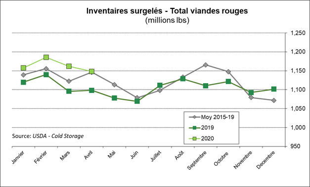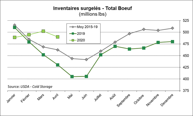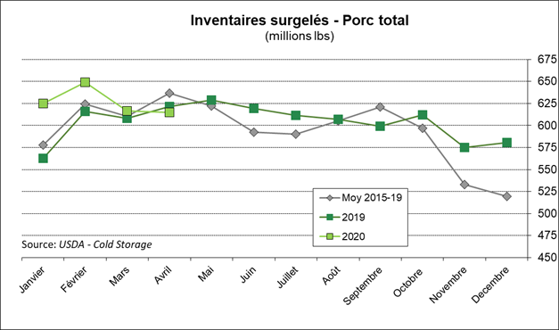 Le rapport Cold Storage de l’USDA, publié hier, démontrait une plus petite baisse des inventaires surgelées au 30 avril que ce qu’on aurait pu s’attendre suite à l’arrêt de certains abattoirs en avril. Dans la volaille, les stocks ont augmenté de 3%, les stocks de porc sont pratiquement inchangés et les réserves de bœuf sont en baisse de seulement -2%. Possiblement que les réserves surgelées diminueront d’avantage en mai, ce qui serait cohérent avec l’exposition de la valeur des coupes de viande observée depuis le début du mois.