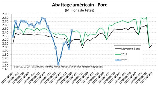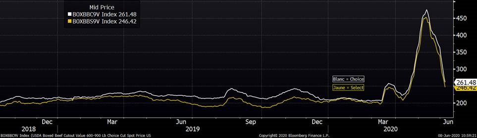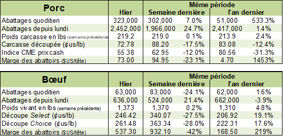 La semaine dernière, les abattage de bœuf sont presque revenus à la normale avec 636,000 têtes abattues, en baisse de seulement 4% versus l’an dernier. Avec autant de bœufs abattus, le marché des découpes se rebalance et on assiste à une dégringolade de la valeur des découpes qui a baissé de 45% en 3 semaines. Le poids des animaux continue d’être pesant, à 1373 lbs/vivant, en hausse de +3lbs versus la semaine dernière et +63 lbs versus l’an dernier. Le poids carcasse était de 824 lbs comparativement à 791 lbs l’an dernier. Au total, la production de viande était de 522.6 millions lbs, en hausse de 22% versus la semaine précédente et est en ligne avec la production de la même semaine en 2019. Autrement dit, la perte des abattages est compensée par le poids plus élevé.