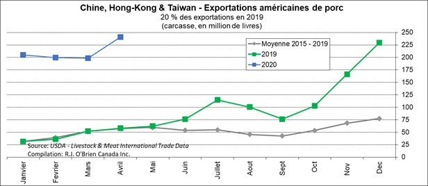 En avril, les exportations nettes de porc des États-Unis a reculé à son plus bas niveau en 2020, à 583 millions lbs, mais demeurent largement supérieures aux ventes de l’an dernier. Les exportations étaient de 641 M lbs, en baisse de 60 M lbs versus le mois de mars, en grande partie expliquée par une diminution des exportations vers le Mexique. Possiblement que le confinement d’avril n’a pas aidé au commerce de viande, puisque plusieurs acheteurs ont diminué leur volume, mais la Chine est venue contrebalancer cet effet avec des achats records de 241 M lbs. C’est pratiquement le quadruple du volume acheté en avril 2019. Les importations de porc ont aussi diminué, à 58 M lbs, ce qui laisse des exportations nettes à 583 M lbs. La croissance des exportations nettes des 12 derniers mois versus les 12 mois d’avant est de +29%.