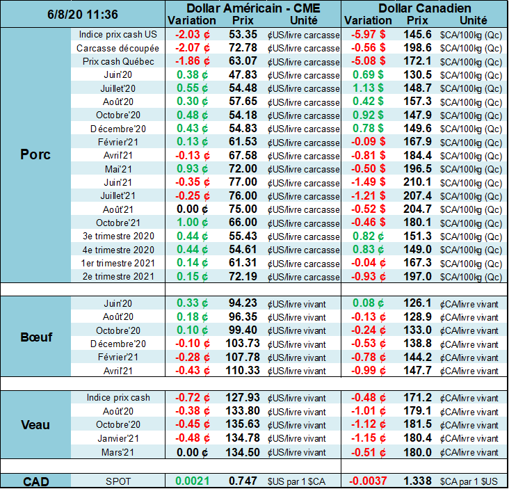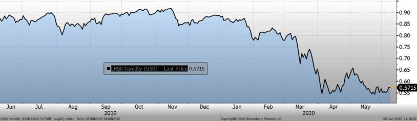 On voit que les porcs en attente cause du tord au prix cash puisque les abattoirs ont le gros bout du bâton dans la négociation du prix. Même si le prix cash était de 53 c/lb à la fin de la semaine et que nous sommes en juin, normalement favorable pour la demande, le marché s’attend à une faiblesse pour encore quelques jours puisque le contrat à terme de juin est à 47.4 c/lb, correspondant au prix cash du 12 juin. Ce sentiment pessimiste ne s’est pas reflété sur les autres échéances lesquelles ont rebondit la semaine dernière. Cependant, si certains traders détiennent des positions d’achat sur juillet, il pourrait être favorable de ne pas attendre à l’échéance avant de rouler les positions sur une échéance plus loin afin d’éviter une divergence entre la faiblesse du cash et la reprise de la confiance sur les mois plus loin. En autant qu’il y aura des millions de porcs en attente, il faudra être vigilent sur les mois rapprochés.