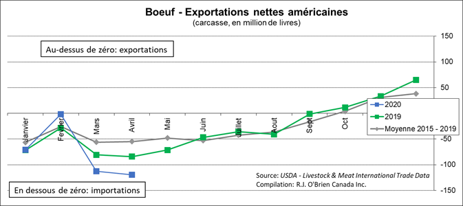 En avril, les exportations de viande de bœuf ont fortement diminué à 235 M lbs, le plus faible niveau depuis février 2019. Les acheteurs qui ont diminué leur volume sont le Mexique et la Corée du sud. Pendant ce temps, les importations ont aussi reculées mais par une plus petite proportion, à 270.6 M lbs. Le plus gros perdant est le Canada dont les exportations vers les États-Unis ont diminué de 70 M lbs en mars à 47.5 M en avril. En somme, les importations nettes étaient de 35.5 M lbs, soit les plus grosses importations depuis 2017.