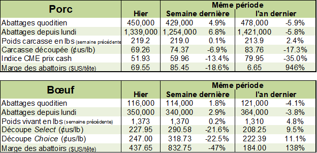 Ce ne sera pas une semaine qui passera à l’histoire pour le marché des viandes avec des prix qui sont presque inchangés depuis le début de la semaine. On note que les abattages reprennent du gallon avec une hausse de +7% dans le porc versus la semaine dernière et +3% dans le bœuf. Bien que les abattages sont en retard versus l’an dernier, il faudra attendre de voir les abattages du samedi avant de savoir si les américains parviennent à écouler les animaux en attentes.