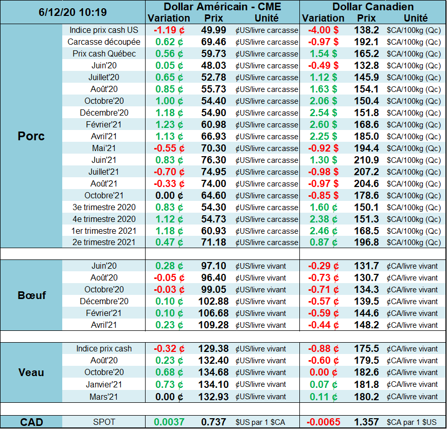 Hier, l’USDA mettait à jour ses bilans d’offre et demande. Rien à dire pour le grain, mais on voit que l’USDA a corrigé le tire dans ses prévisions pour la viande, particulièrement le bœuf. Il n’y a que les fous qui ne changent pas d’idée! Dans l’ensemble, l’augmentation marquée de la production du 2ème et 3ème trimestre, comparativement au rapport de mai, reflète le fait que les abattoirs ont repris les opérations plus rapidement qu’anticipées. C’est une bonne nouvelle. Pour le porc, la production du 2ème trimestre continuera d’afficher un important déficit par rapport la production de l’an dernier, mais l’USDA semble confiant que les porcs en attente seront abattus durant le 3ème trimestre avec une production record de 7 milliards de livres, soit 4.4% de plus qu’en 2019. Cohérent avec la crise du mois de mars et les abattages de truies, l’USDA maintient ses prévisions pour la fin 2020 et début 2021 lesquelles prévoient une baisse de production de -4 à -5% versus 2019. On pourrait donc s’attendre à une remontée du prix cash après l’été, une fois que les porcs en attente ont été écoulés et que la production se resserrera.