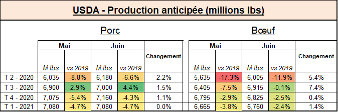 Dans le bœuf, c’est une révision majeure pour la production du 2ème trimestre qui passe de 5.6 M à 6 M lbs. La révision est encore plus importante pour le 3ème trimestre qui passe de 6.4 M à 6.9 M livres, soit 7.4% de plus dans le rapport de juin qu’en mai. La production devrait donc revenir à des niveaux similaires à 2019 dès cet été. Cela signifiera que les sorties des parcs d’engraissement reprendront de la vigueur dès le mois de juin.