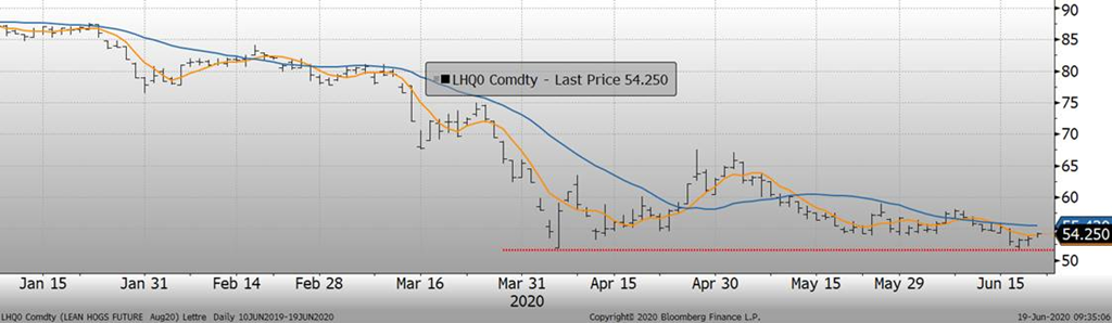 Après plusieurs semaines de ventes à l'exportation faibles et même négatives, la semaine dernière a vu à la fois des exportations solides et de nouvelles commandes. La semaine dernière, les expéditions totales se sont élevées à 33 543 tonnes, en baisse d'environ 9% par rapport à la moyenne des quatre dernières semaines, mais toujours nettement plus élevées que l'année précédente. Les exportations vers la Chine ont atteint 13 697 MT, en baisse de 10% par rapport aux quatre semaines précédentes, mais elles sont plus élevées que toute autre destination. Il y a eu une augmentation notable des expéditions vers Hong Kong, un marché qui a été en grande partie inactif ces derniers mois. Les exportations vers le Japon et la Corée du Sud ont enregistré une tendance à la baisse, car les prix élevés en mai et au début de juin ont limité les ventes à l'exportation vers ces marchés. L'élément le plus positif du dernier rapport était les nouvelles ventes nettes. Les ventes à la Chine ont atteint près de 10 000 tonnes, soit environ 150% de plus que les quatre semaines précédentes. Il y a eu beaucoup de spéculations sur le fait que les bas prix actuels pourraient commencer à encourager les acheteurs chinois à entrer sur le marché américain (d’autant plus que les chinois doivent acheter pour respecter l’entente de phase 1). Ce dernier rapport a fourni des preuves que c’est en train de se produire. Les prix extrêmement bas des jambons et un dollar américain plus faible semblent également avoir simulé les ventes à l'exportation vers le Mexique, à 13620 tonnes, qui étaient 80% plus élevées que les quatre semaines précédentes. Nous constatons également de meilleures ventes en Corée du Sud et au Canada tandis que les ventes au Japon restent décevantes. Nous nous attendons à ce que la récente baisse des prix de la longe et l'augmentation de l'offre entraînent une augmentation des ventes au Japon, mais cela ne s'est pas encore produit. Dans l'ensemble, un rapport positif bien que peu haussier pour le marché à court terme.