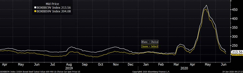 Le rapport hebdomadaire sur les exportations continue de montrer qu'à court terme, les volumes d'exportation de viande bovine restent limités. Il s'agit d'une fonction des prix extrêmement élevés qui ont prévalu en mai, limitant l'offre qui a été vendue pour l'exportation vers les principaux marchés d'Asie et d'Amérique du Nord. La semaine dernière, les exportations de viande bovine ont atteint 8 464 tonnes métriques, en baisse de 21% par rapport aux quatre semaines précédentes et de 56% de moins qu'il y a un an. Les prix records de mai ont considérablement rationné à la fois les dômes c et la demande d'exportation en raison de l'offre fortement limitée et de l'incertitude sur les niveaux d'abattage en juin et au-delà. L'abattage a repris et la production de bœuf la semaine dernière était en fait plus élevée qu'il y a un an. Le manque d'activités d'exportation et domestique a poussé plus de produits sur le marché au comptant et fait baisser les prix du bœuf. La découpe de bœuf Choice mercredi soir était en baisse de 10 $ / 100 lbs. Néanmoins, il semble que les bas prix actuels génèrent beaucoup d'intérêt et entraînent une hausse significative des ventes à l'exportation. Pour la deuxième semaine consécutive, les ventes nettes à l'exportation de bœuf ont dépassé 20 000 tonnes. Les ventes nettes vers la Corée du Sud se sont élevées à 8 848 tonnes après 7 211 tonnes vendues la semaine précédente. L'année dernière, les expéditions hebdomadaires à l'exportation vers la Corée du Sud en juillet étaient en moyenne de 4600 TM/semaine et les expéditions d'août en moyenne de 4200 TM. Si les ventes des deux dernières semaines se maintiennent, nous nous attendons à une amélioration notable des exportations vers la Corée du Sud en juillet et août. Les ventes au Mexique, au Canada et en particulier à Hong Kong ont été nettement supérieures à celles des quatre semaines précédentes. La tendance des ventes à l'exportation de bœuf est plus élevée, ce qui suggère que davantage de produits seront acheminés vers les circuits d'exportation en juillet et août.