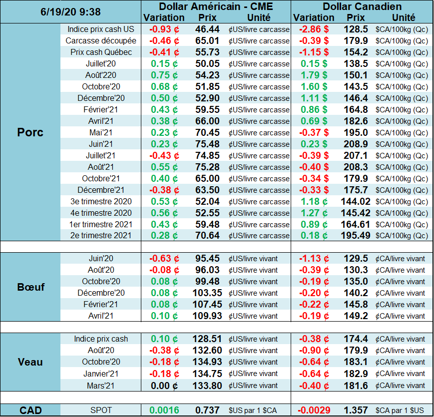 L'optimisme est le sentiment dominant ce matin, alors que les relations sino-américaines semblent reprendre et que des pourparlers de relance économique ont lieu en Europe. La Chine a annoncé qu'elle accélérerait ses achats de produits agricoles pour se conformer à l'accord de phase 1. On pourrait donc s’attendre à une retour en force des commandes de porc et soya dans les prochaines semaines. Le marché du porc gagne 1c/lb ce matin, à l’exception du mois de juillet et est inchangé en raison de la faiblesse du cash.