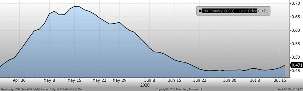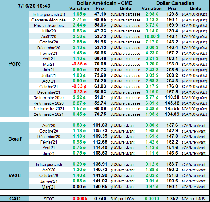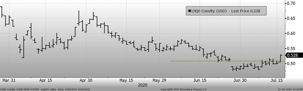 Le marché des viandes remontent fortement ce matin. Pour le marché du porc, on commence à voir quelques signes encourageant avec un prix cash qui remontait à 47.50 c/lb hier, en hausse de 1.75c en 2 jours! Bien qu’on parte de très loin, le prix cash semble entamer une tendance haussière, en plus du prix des découpes qui remonte au plus haut niveau depuis la mi-juin. Ce vent optimiste influence d’avantage l’échéance du mois d’août puisque les bonnes statistiques sont sur le cash, le mois d’août gagne près de 3.5 cents ce matin à 53.50 c/lb, tout près de la limite journalière de +3.75c. Techniquement, avec la poussée de ce matin, le prix d’août a rempli le gap formé le 26 juin (lendemain de la publication du Hogs & Pigs) ce qui est élément positive pour le prix à court terme.