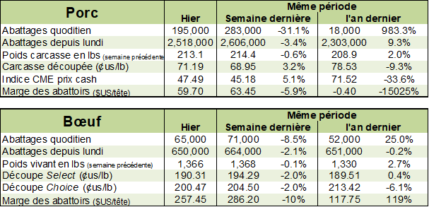 Les abattages de bœuf étaient de 650,000 têtes, en baisse de -0.8% versus l’an dernier. Cependant, avec le poids des bêtes qui est plus élevé par 24 lbs/carcasse à 830 lbs (1366 lbs/vivant), la production est en hausse par 2% versus l’an dernier à 538.4 millions lbs. Les transactions cash de la semaine dernière demeurent sous la barre du 1.00 $US/lb, avec des ventes à 0.97$ au Nebraska jeudi et 0.95$ au Kansas.