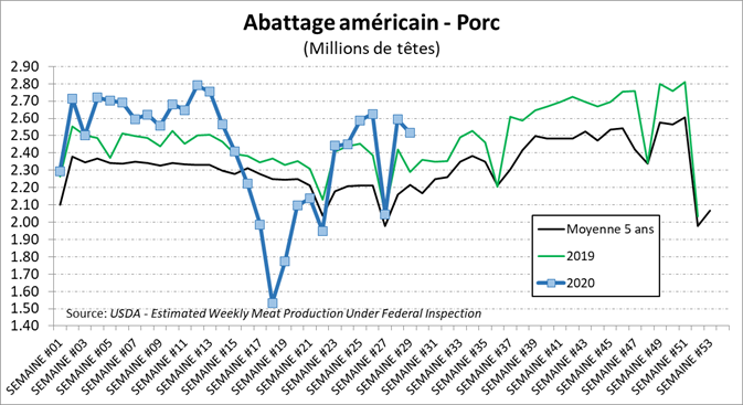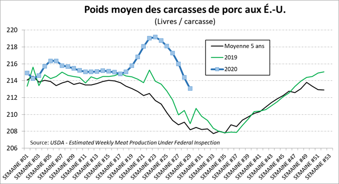 La semaine dernière, les abattages de porc étaient 10% supérieur à l’an dernier avec 2.52 millions porcs, toujours gonflés par le rattrapage du printemps pour écouler les nombreux porcs en attente. En principe, il en reste encore pour quelques semaines avant d’avoir terminer d’écouler les porcs en attente, environ 5 ou 6 semaines selon le Hogs & Pigs. Les chaudes températures de la semaine dernière ont joué leur rôle sur le poids des bêtes qui était en forte baisse, à 213 lbs/carcasse, mais demeure au-dessus des poids de l’an dernier. En somme, la production de porc était de 536.5 millions de livres ce qui est 12% de plus que l’an dernier. Avec autant de porcs qui sortent des abattoirs, le prix cashrestera sous pression jusqu’à ce que la production se normalise, mais on voit dernièrement un petit regain.
