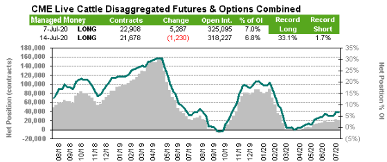 Entre le 8 et 14 juillet, les spéculateur ont acheté 3825 contrats au net ce qui représente l’une des plus grosse augmentation depuis le début du printemps. Leur position reste minime à 10,480 contrats net acheteur, on pourrait donc voir une vague d’achat si la tendance haussière qui commence se maintient pendant quelques temps.