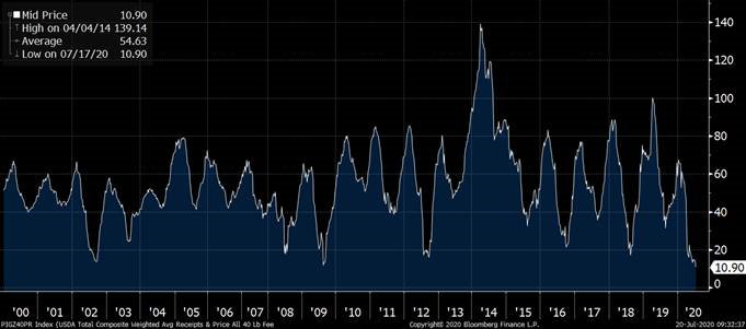 Ce qui est moins encourageant, c’est de voir la valeur du porcelet de 40 lbs qui continue de creuser de nouveaux bas, à 10.90 $US/tête. C’est le plus bas prix depuis que les données sont répertoriées en 2000. Définitivement, les maternités vont subir de lourde perte ce qui devrait maintenir la décroissance du troupeau reproducteur pour encore 1 ou 2 trimestres. Cela se fait ressentir sur les données d’abattage puisque 2.5% des porcs abattus durant la semaine du 4 juillet étaient des truies de réforme, comparativement à 2.0% des abattages de l’an dernier.