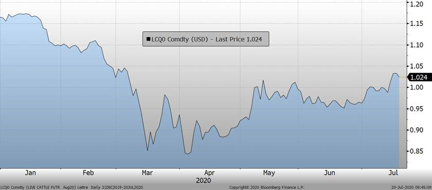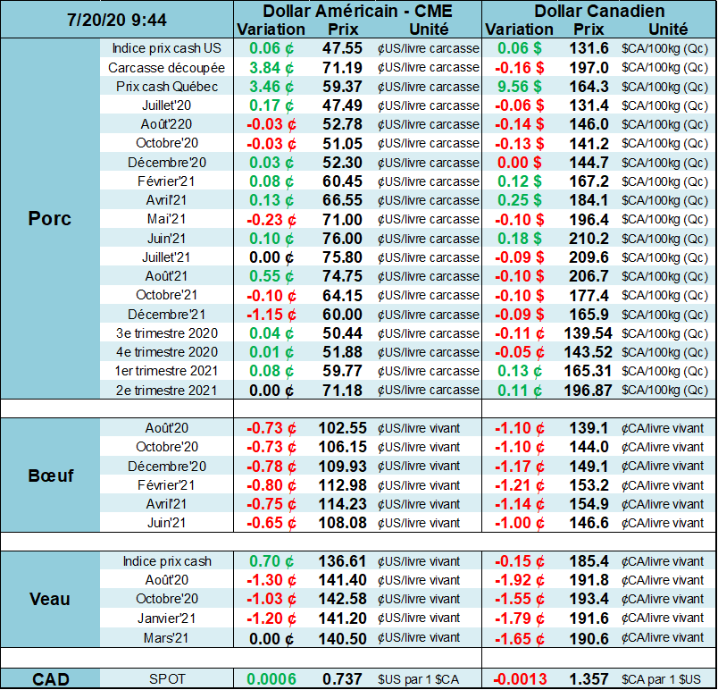 Après un mois d’inactivité pour le prix cash US, oscillant entre 45 et 46 cents/lb, le prix s’est apprécié ces 6 dernières publications pour gagner 2.43 cents. Ce n’est pas grand-chose, mais ce qui est encourageant est la nouvelle direction du cash qui est haussier et le marché semble y croire puisque les contrats d’août se transigeait à 53 cents vendredi versus l’indice CME à 47.55 cents. Le prix de la découpe a terminé la semaine sur une bonne note, en hausse de 3.84 cents vendredi, à 71.19 cents, le plus haut prix depuis 5 semaines. Le prix du jambon fait la différence lequel se transigeait dans les 40 cents/lb en juin et qui avoisine présentement 70 cents/lb. Mercredi à 15h00, l’USDA publiera le rapport Cold Storage et on aura plus d’information sur la situation des différentes coupes à ce moment.