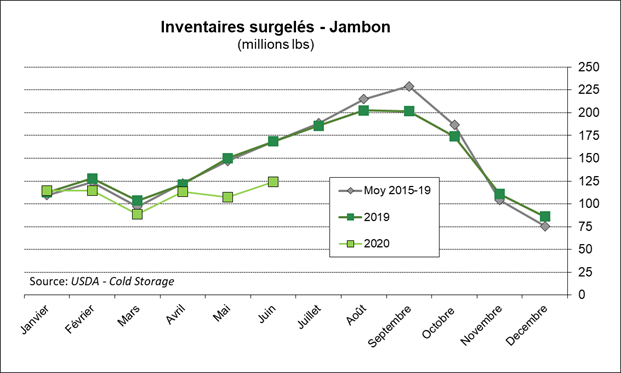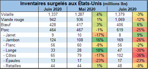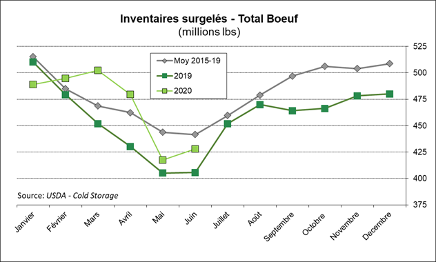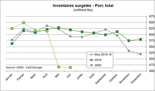 L’USDA publiait hier les inventaires surgelés à la fin juin et on note un rebond des inventaires depuis les creux du mois de mai. Les inventaires ont augmenté par 11 millions de livres en juin pour terminer le mois à 428 millions lbs. C’est à mi-chemin entre les inventaires de l’an dernier (405.6 M lbs) et la moyenne quinquennale (441.6M lbs). Les inventaires surgelés des viandes rouges est toutefois en baisse de 12% par rapport l’an dernier, mais c’est principalement les inventaires de porc qui tiennent les stocks surgelés faibles.