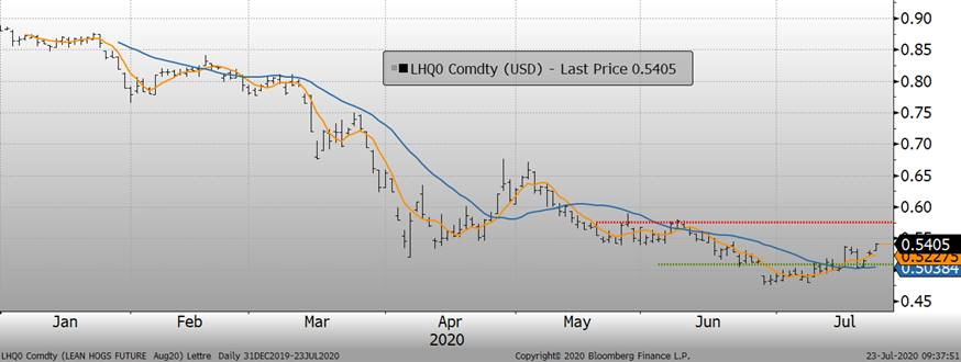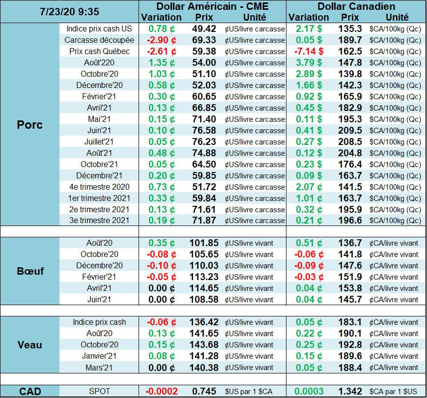 Ce matin, le prix du porc à Chicago s’apprécie d’environ 1 cents sur les mois de 2020 grâce à de bonnes ventes à l’exportation et un rapport Cold storage positif pour le prix. Le marché du porc n’a pas de trajectoire claire cette semaine, récupérant graduellement de la chute de lundi matin. Le prix cash continue à se raffermir, mais le momentum haussier n’est pas stable dans la valeur du porc découpée. Après d’avoir atteint de nouveau sommet mardi après-midi, à 72.23 c/lb, le cutout a perdu presque 3 cents hier. Les abattages des 3 premiers jours de la semaine totalisent 1.42 millions de porcs ce qui est sensiblement le même volume que l’an dernier, donc à moins d’avoir une journée avec beaucoup d’abattages samedi, l’écoulement de porcs en attente n’aura pas beaucoup avancé cette semaine.
