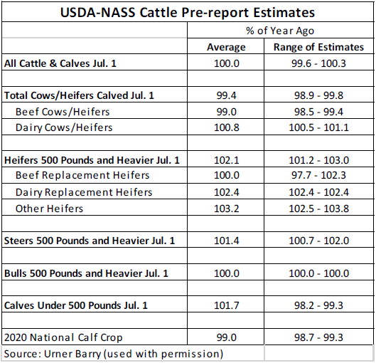 Vendredi, l’USDA publiera le rapport biannuel du cheptel bovin aux États-Unis, en date du 1er juillet. Les analystes ne s’attendent pas à de gros changement comparativement au troupeau de l’an dernier, avec un cheptel reproducteur un peu plus petit pour les vaches de boucherie, mais plus élevé pour les vaches et génisses laitières. Aussi, les analystes s’attendent à presque 2% plus de veaux de 500 lbs et moins.