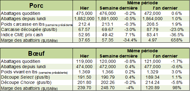 La découpe de porc de l'USDA, publiée après la clôture hier, s'est établie à 67,17 $, en baisse de 13 cents par rapport à 67,30 $ mercredi et par rapport à 68,69 $ la semaine précédente. Il s'agissait du plus bas prix des découpes depuis le 16 juillet. L'indice CME au 28 juillet était de 52.95 cents/lb, contre 51.10 la session précédente et 49.42 la semaine dernière. L'abattage de porcs estimé par l'USDA s'est élevé hier à 475 000 têtes. Cela porte le total de la semaine jusqu'à présent à 1.882 million de têtes, en hausse par rapport à 1.861 million il y a un an. La production réelle de porc aux États-Unis pour la semaine se terminant le 18 juillet s'est établie à 533,3 millions de livres, maintenant en hausse de 11.4% par rapport à il y a un an et c’est cette abondance qui semble inquiété le marché.