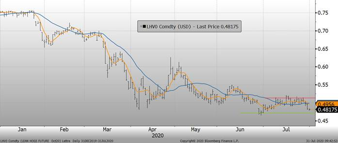 Bien que les nouvelles concernant la demande à l'exportation restent fortes, les traders restent très inquiets à l'idée que les niveaux de production demeurent élevés ce qui pourrait maintenir la pression sur les prix américain. Les poids restent plus élevés qu’à la normale et il peut être difficile pour le marché d'absorber l'offre importante de viande de porc à court terme. Le marché devrait connaître la plus forte augmentation jamais enregistrée de la production de porc entre le deuxième et le troisième trimestre, ce qui pourrait contribuer à faire baisser les prix du porc de façon saisonnière. Au cours des 20 dernières années, la production de porc du deuxième au troisième trimestre a normalement augmenté d'environ 100 millions à 200 millions de livres. Cette année, l'USDA voit la production de porc augmenter d'un record de 995 millions de livres, mais c’est évidemment l’arrêt des abattoirs au deuxième trimestre qui a créé cette divergence.