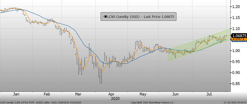 Bien que les chiffres des abattages aient été lents ces dernières semaines, les chiffres devraient commencer à largement surpasser les volumes d’il y a un an dans les semaines à venir. Cela devrait stimuler la production car les poids restent bien supérieurs aux niveaux de l'an dernier. Le poids moyen des carcasses pour la semaine se terminant le 18 juillet s'est établi à 899 livres, contre 902 la semaine précédente, mais contre 866 il y a un an. Le poids hebdomadaire moyen sur 5 ans pour cette semaine est de 874. La découpe de bœuf a clôturé 0.69 plus haut à 201,80 $. C'était en baisse par rapport à 202,26 $ la semaine précédente et 214,24 $ il y a un an.