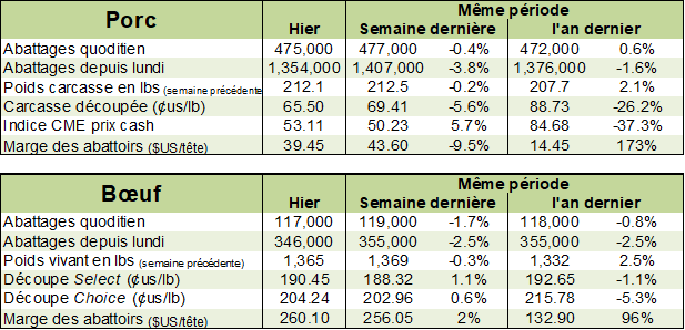 Le marché continue de rester dans une tendance haussière à court terme malgré une prime importante versus sur le marché au comptant et les attentes selon lesquelles l'offre pourrait gonfler dans les semaines à venir. Des ventes hebdomadaires à l'exportation élevées et un marché au comptant assez fort ont contribué à soutenir le marché de Chicago. Le prix des bovins vivants au comptant se raffermissaient à mesure que nous avançons dans la semaine. Au Nebraska, 3478 têtes se sont échangées mercredi à un prix moyen de 99.87$, et jeudi, 1577 têtes se sont échangées à une moyenne de 100.04$. C'est une augmentation versus 98$ la semaine dernière. Mercredi également, 11,421 têtes ont été échangées à un prix moyen de 96,91 $ au Texas / Oklahoma, contre 95 $ plus tôt dans la semaine et 96 $ la semaine dernière. Bien que les chiffres des abattages aient été lents ces dernières semaines, les chiffres devraient commencer à dépasser largement les volumes d’il y a un an, dans les semaines à venir. Cela devrait stimuler la production car les poids resteront bien supérieurs aux niveaux de l'an dernier.