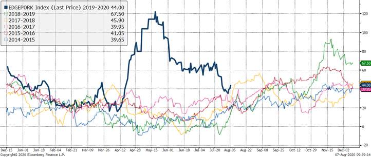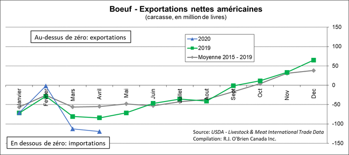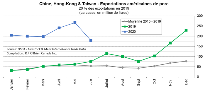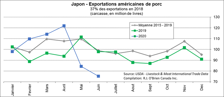 Cette semaine, autant les chiffres d’exportation du mois de juin publiés mercredi que les ventes à l’exportation de la semaine dernière, publié jeudi, étaient décevants. Les exportations de juin étaient de 515 millions lbs ce qui représente le plus petit volume vendu depuis septembre 2019. On est loin du 701 M lbs du mois de mars! Bien que la Chine demeure le plus de gros client, son volume a baissé par 83M lbs en juin pour se chiffrer à 170 M lbs. C’est tout de même plus que deux fois le volume de juin 2019, donc sur une perspective annuelle, les ventes vers la Chine sont toujours très bonnes. C’est les ventes vers le Japon qui ont grandement déçu, à seulement 75M lbs, alors qu’historiquement, c’est le deuxième meilleur acheteur. Le Mexique demeure un client stable avec +/- 100M lbs par mois au 2ème trimestre. Du côté des importations, c’est 79.2M lbs de porc qui sont entrées aux États-Unis, donc 48.2 M provenaient du Canada. Les exportations nettes (export – import) totalisaient 436 millions livres, légèrement mieux qu’en juin 2019 par 10M lbs, mais nettement moindre qu’en mai 2020 à 535M lbs.