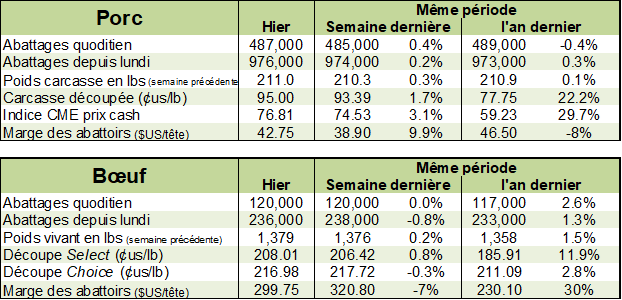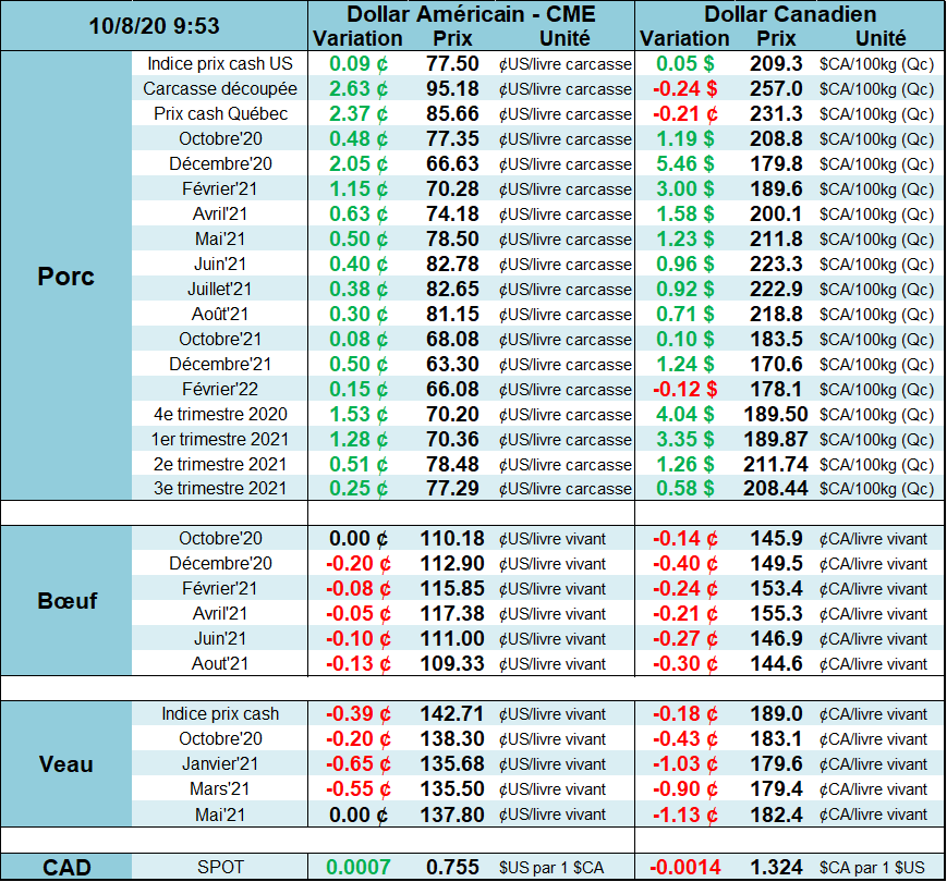 Le cash et le contrat d’octobre ne cesse de monter. Ce matin, le contrat d’octobre atteint 77.25 cents/livre, soit l’équivalent à 207 $CA/100kg et ça, c’est sans l’ajustement pour la découpe! Mieux vaut en profiter pendant que ça passe. Le contrat de décembre gagne 2 cents ce matin à 66.75 c/lb. L’engouement vient des bonnes ventes à l’exportation publiées ce matin.