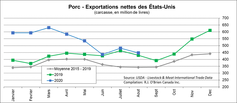 La mise-à-jour du carnet de commande pour l’exportation vient contrebalancer les chiffres de commerce du mois d’août qui n’étaient pas exceptionnels. Malgré un prix très faible, les États-Unis ne sont pas parvenus à vendre plus de porc que l’an dernier pendant l’été. Pour le mois d’août, les exportations étaient seulement de 527 M livres ce qui est nettement moins que les 701 M lbs du mois de mars. Le Mexique et la Chine combinés représentaient la moitié des exportations d’août. À ce volume, on soustrait les importation de 79.8 M lbs, principalement en provenant du Canada, pour des exportations nettes de 447 M livres.