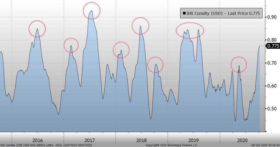 Cette semaine, on s’en ligne pour une production similaire à 2019 et ce, pour une 5ème semaine consécutive ce qui signifie que la surabondance de porc sur le marché américain est résorbée, mais demeure volumineuse. Si la production est similaire à 2019, qu’est-ce qui explique les prix actuels? Comme le démontre les ventes à l’exportations, c’est la forte demande internationale avec la Chine qui achète tout ce qui est possible. Pas juste du porc, mais la Chine achète d’important volume de grains et de métaux pour satisfaire leur consommation et rétablir leurs inventaires « stratégiques ». Avec un cutout à 95 cents et un prix cash qui ressemble plus à un prix pour la St-Jean que l’Action de grâce, on peut en déduire qu’une partie des exportations allemandes s’est retrouvée sur le marché américain. La question ultime : pendant combien de temps?