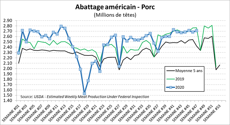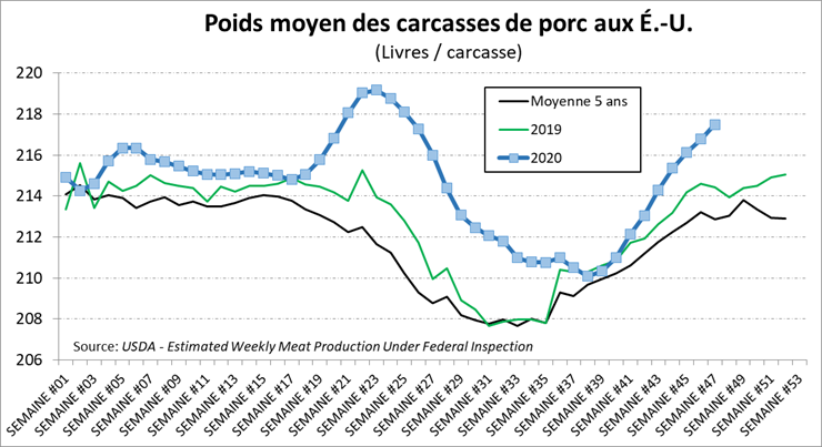 La semaine dernière, les abattages étaient de 2.71 millions têtes, ce qui représente 1% de plus que la semaine dernière, mais 2 % de moins que l’an dernier à pareille date. Cependant, le poids ne cesse d’augmenter avec une moyenne de 217.5 lbs/carcasse, en hausse de +0.7 lbs versus la semaine dernière. L’augmentation de poids reflète une augmentation de +1.4% sur la production de porc. De la sorte, la production de la semaine dernière affichait seulement un déficit de -0.6% versus l’an dernier avec 590 millions de livres.