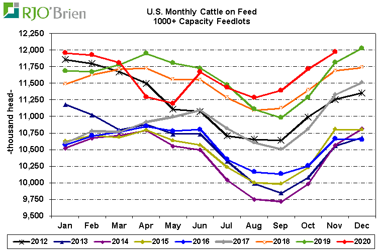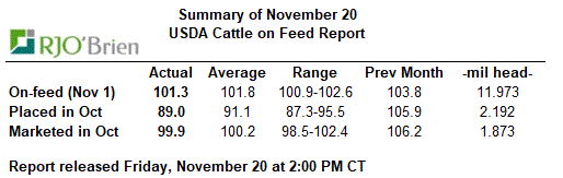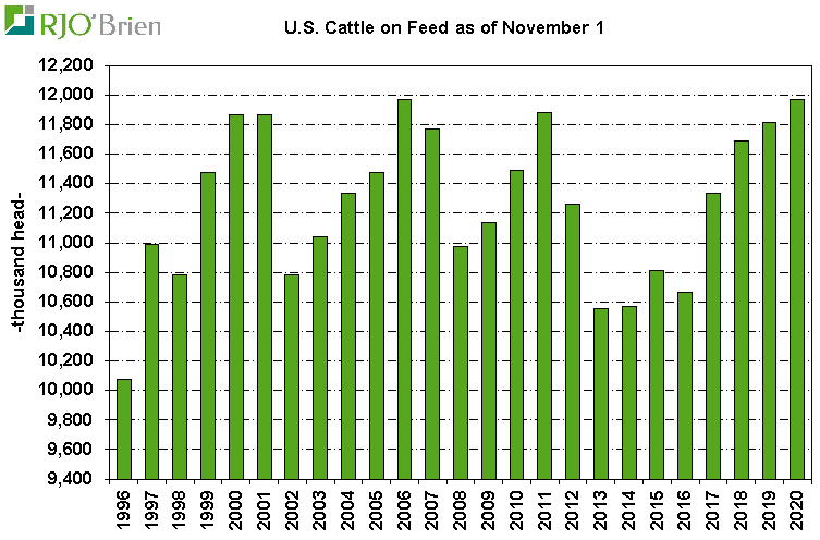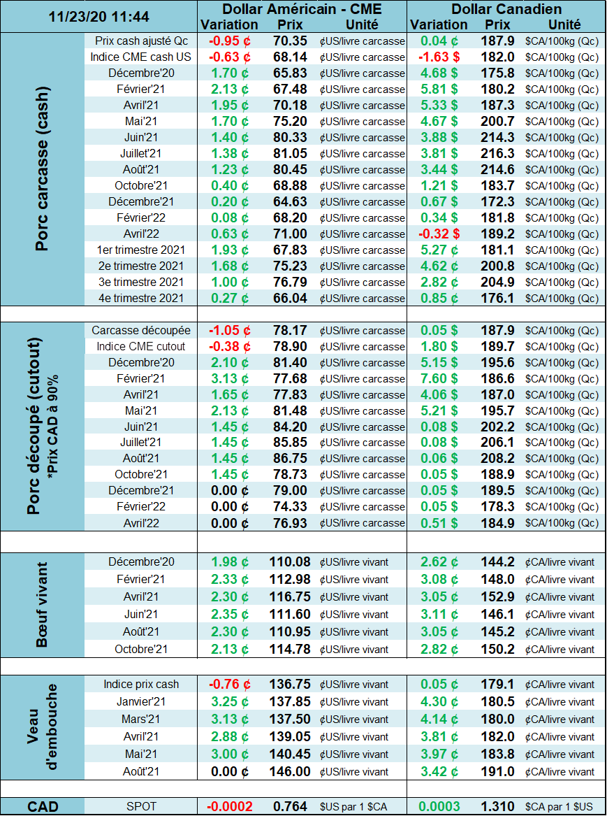 Vendredi, l’USDA a publié les données des bœufs en parc d’engraissement en date du 1er novembre. Le nombre d’animaux en parc était un peu plus faible qu’attendu ce qui fait monter les prix à Chicago ce matin. Les attentes s’établissaient à une croissance de +1.8% et finalement, il y a 1.3% plus de bœuf en parc qu’au 1er novembre 2019, pour un total de 11.97 millions têtes. Toutefois, ce sont des niveaux records depuis au moins 10 ans. La surprise fût les placements d’octobre qui étaient 2% plus faible qu’anticipé, à 11% de moins que l’an dernier, soit 2.2 millions de veaux d’embouche. Fort possiblement que quelques placements ont été devancés en juillet-aout-septembre ce qui impacte négativement les placements d’octobre puisqu’il restait moins de veaux en pâturage. La commercialisation était aussi un peu plus faible qu’attendu également, à -0.1% versus des attentes de +0.2% versus octobre 2019.