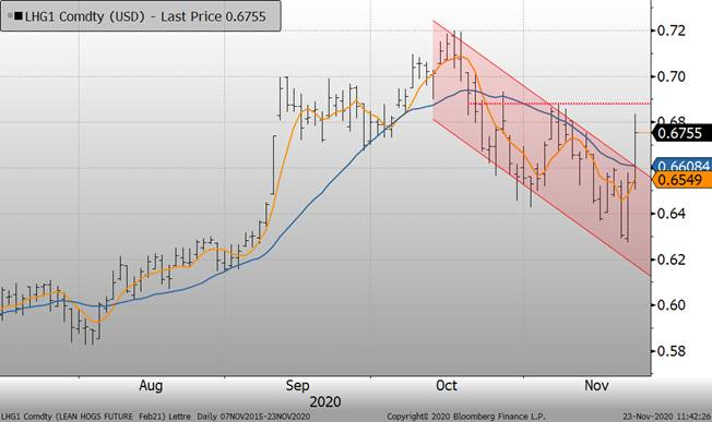 Depuis 2 jours, les contrats de porc sont en forte hausse. Il n’y a pas d’élément clair pour ce rebond de 4.5 cents en 2 jours, mais l’optimisme entourant la réouverture des restaurants lorsque le vaccin sera en circulation semble gonfler les prévisions pour la demande. En parallèle, le coût de l’alimentation continue de monter ce qui n’est pas un facteur propice à l’expansion pour 2021. Du côté technique, le prix sort de la tendance baissière du dernier mois, mais fait face à d’importantes résistances à 66.5 cents sur décembre et 68.5 cents sur février.