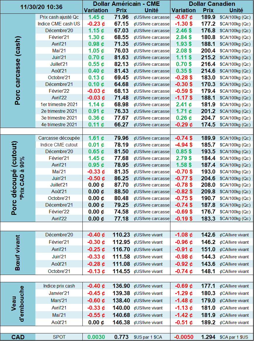 Ce matin, le marché du porc est positif, se transigeant avec un gain de 1 cent/lb. Plusieurs échéances se transigent au plus haut niveau depuis le début novembre ce qui est un peu contre intuitif aux dernières nouvelles. D’une part, les ventes à l’exportation de la semaine dernière étaient très décevantes. D’autre part, les chiffres de production démontrent une offre de viande excédentaire à l’an dernier avec 3% plus de porcs produits pour la semaine de la Thanksgiving.