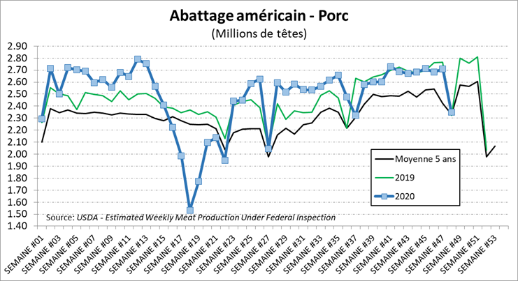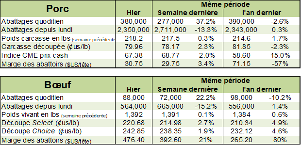 Du côté de la production, le poids des animaux continuent à créer une augmentation de production comparativement à l’an dernier. Alors que les abattages étaient seulement 1.2% de plus que l’an dernier, le poids de 218 lbs (+1.7%) ne cesse d’augmenter. En somme, la production de la semaine dernière était de 512.7 M livres, en hausse de +2.9% versus l’an dernier.