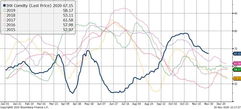 Bien que le prix cash n’ait toujours pas arrêté de baisser, la baisse n’est pas très abrute pour un mois de novembre et normalement, le prix cash atteint son creux au début décembre, juste avant la forte demande pour les célébrations de Noël. C’est possiblement ce qui atténue le pessimise du marché et fait en sorte que le contrat de décembre rebondit à 67.00 cent ce matin.