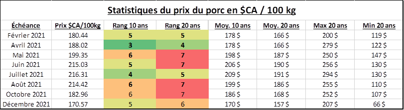 Aussi, au-delà du mois de juillet 2021, les prix sont sous la moyenne 10 ans et se classent généralement sous la médiane (5ème prix sur 10 ans). Par exemple, le mois d’octobre à 183 $CA/100kg est sous la moyenne des 10 dernières années (186$) et serait le 6ème meilleur prix depuis 10 ans ce qui ne représente pas réellement une opportunité de vente, encore moins considérant le changement du coût de production. Pour ses raisons, mieux vaut attendre avant de vendre plus de porc sur la 2ème moitié de l’année. Pour un éleveur n’ayant aucune position, avril 2021 semble un bon point de départ tout juste sous la barre du 190 $CA/100kg.