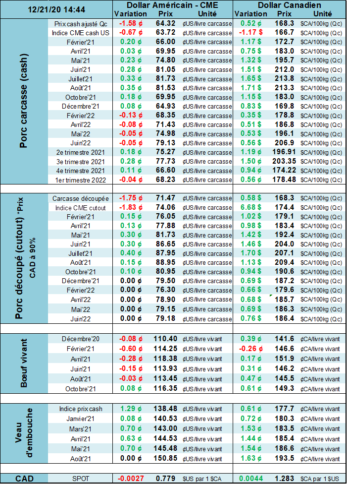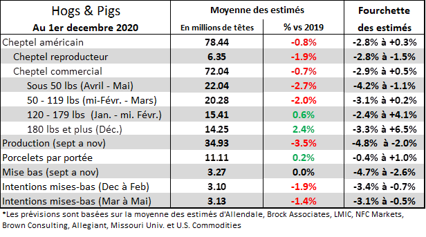 Mercredi après-midi, l’USDA publiera le rapport trimestriel Hogs and Pigs, dévoilant le cheptel porcin aux États-Unis au 1er décembre. Si les prévisions se réalisent, ce serait la première contraction du troupeau américain depuis la DEP au printemps 2014. La plus importante baisse est au niveau de cheptel reproducteur avec presque 2% moins de truies. Évidemment, les importantes pertes qu’ont connu les maternités en 2020 auront des impacts sur toutes la production américaine de la prochaine année. Ci-dessous, vous trouverez les estimés du rapport de mercredi. Il y aura aussi le rapport Cold Storage mardi après-midi.