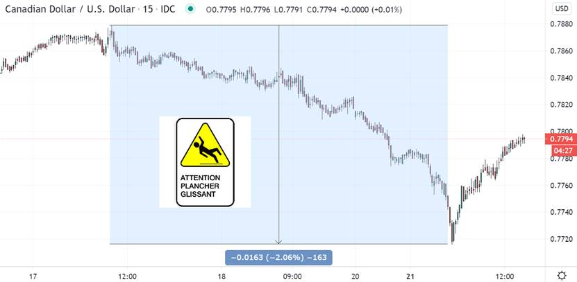 Panique ce matin donc, et une des positions la plus « populaire » depuis des mois est de vendre de dollar USD (et acheter des matières premières !) Il y a plus de monde dans cette trade-là qu’un samedi après-midi au Costco avant un lockdown de 28 jours. Ou la SAQ un vendredi soir… Comme dirais José Théodore, « Bonne chance » ! En temps incertain les marchés financiers se réfugient dans le dollar américain : comme au printemps, par exemple. Et avant de reprendre ses esprits durant la session, le CADUSD a plongé rudement. Entre vendredi midi et ce matin, notre huard a plongé de 160 points de 78.80 à 77.20 pour rebondir légèrement. C’est difficile (impossible) à prévoir l’avenir, mais ce genre de volatilité doit être pris au sérieux comme étant un warning (plancher glissant !) si jamais la situation se dégrade rapidement. La peur est un élément déclencheur très puissant.