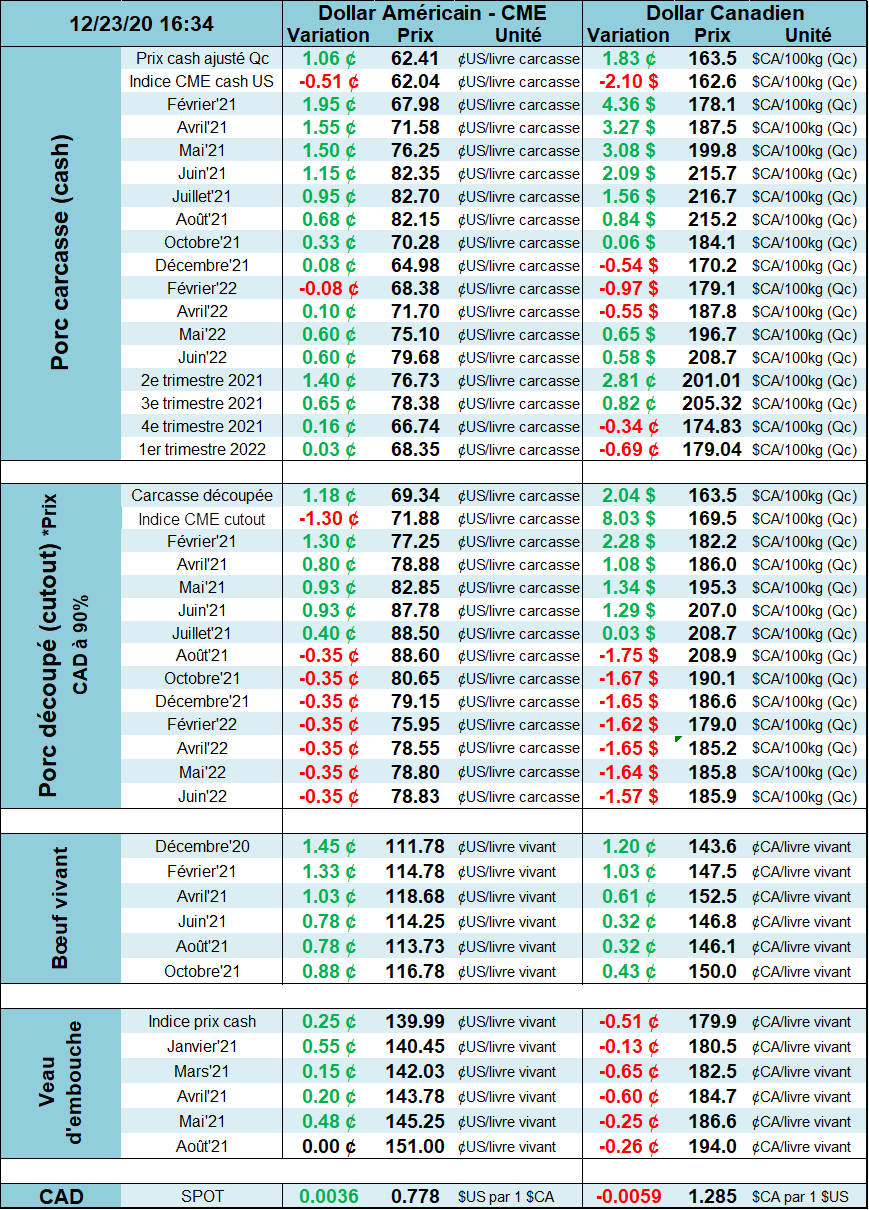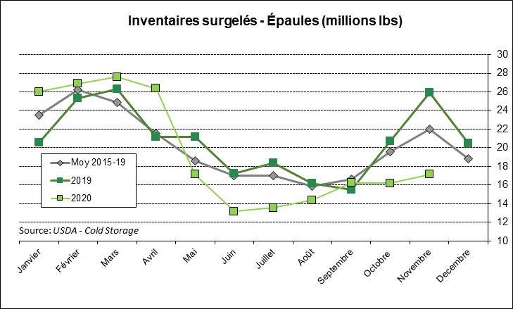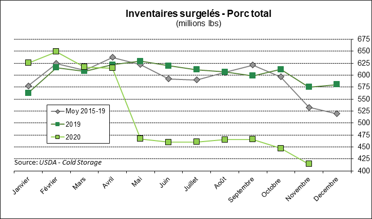 Le rapport de Cold Storage est aussi sorti hier en fin de journée et la quantité de viande détenues dans les congélateurs américains sont encore relativement faibles par rapport aux normes historiques. Au 30 novembre 2020, les inventaires de viande de porcs se situaient à 414.13 millions de livres c’est 28% de moins que la quantité de l’an dernier. Nos savons que depuis mars dernier, nous vivons dans une nouvelle réalité concernant les inventaires de viandes. La chaines d’apprivoisement s’est peut-être écourtée certains entrepôts qui accumulaient du porc sont peut-être devenus caduques. Il a probablement moins de zone d’entrepôts pour acheminer cette viande aux consommateurs. Avec les restaurants fermés, la viande est principalement détenu par des supermarchés et certains transformateurs qui veulent davantage acheter du frais. Par contre, en cas de problèmes d’abattages il y aura peu de marge de manœuvre et cette situation pourrait engendrer une nouvelle volatilité dans le prix et surtout sur la découpe. Il faudra être à l’affut des opportunités en tant que producteurs pour gérer ce prix éventuellement.
