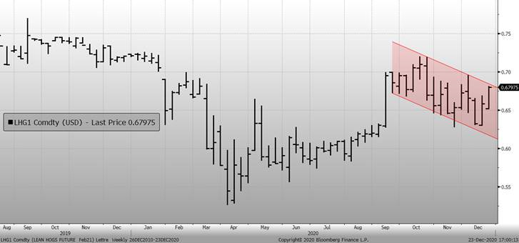 Cependant, à court terme, le nombre de porc à abattre ne diverge pas tant des prévisions avec 14 M porcs de 180 lbs et plus et 15.25 M porcs de 120-179 lbs. La rareté commencera à se faire sentir vers le mois de mars lorsque les porcs d’un centaine de livres atteindront la maturité et cela s’accentuera en avril. Bien que ce soit plus faible qu’attendu, l’USDA a aussi révisé à la baisse le troupeau au 1er décembre 2019 par 1 millions de porcs. On n’aura donc pas une énorme chute de la production, bien qu’une baisse du nombre de têtes combinée avec de la moulée plus dispendieuse sont 2 facteurs positifs pour les prix de 2021.