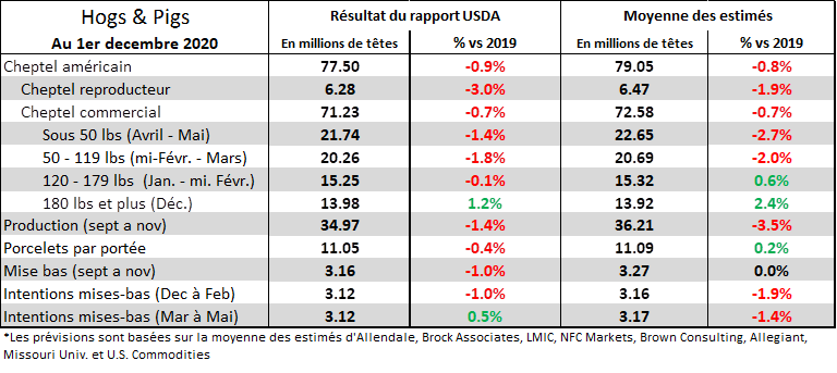 Cet après-midi, le USDA a révélé le très attendu rapport trimestriel Hog & Pig. Les attentes du marché et les résultats du USDA sont dans ce tableau :