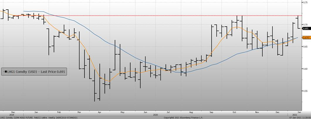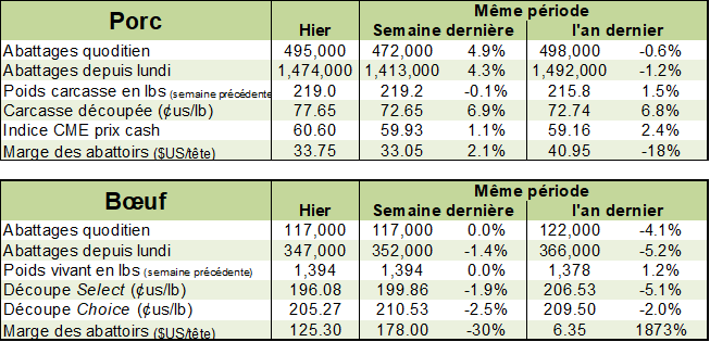 Du côté des abattoirs américains, Smithfield Foods prépare activement une campagne de vaccination à l’usine pour ses employées ce qui devrait diminuer les problèmes d’absentéisme et augmenter sa main d’œuvre disponible. Du côté de Tyson Food, on annonce le retour de son abattoir en Iowa (à Columbus Junction) qui a été fermé pendant 3 semaines en raison de problèmes mécaniques sur la chaine d’abattage. De la sorte, on devrait se retrouver avec de moins en moins de pression sur la livraison des porcs et possiblement que le poids des carcasses pourrait baisser.