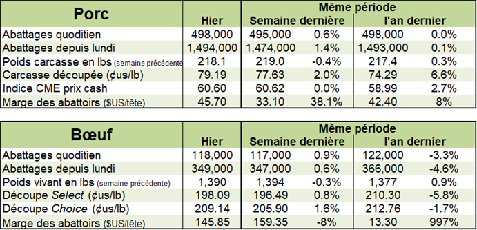 Par chance, les prix de la découpe et au comptant ont recommencé à augmenter récemment. Prochaine étape pour supporter la hausse des prix c’est de constater une baisse des abattages. Il est bien possible que cela se produise plus tôt que tard. La montée en puissance de certains virus ont surement provoqué une baisse des mise-bas (pertes de porcelets) à la fin de l’automne dernier chez plusieurs producteurs américains et ontariens. Le Québec ne fut pas en reste avec de malheureux événements survenus dans certaines porcheries de la province (SRRP).