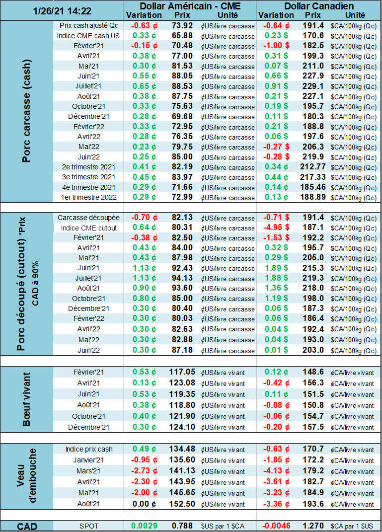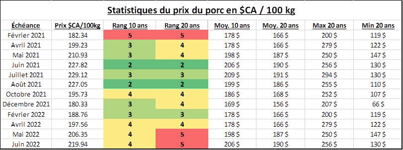 Au final, ce qui importe, c’est le niveau de prix actuel et la tendance qui est haussière. Bien que les coûts d’alimentation seront très élevés en 2021, il y a encore de l’espoir du côté de la rentabilité. Présentement, certaines échéances représentent le 2ème meilleur prix en 20 ans (à l’exception de 2014), dont le mois de juin et août 2021. Plusieurs autres échéances sont aussi très intéressantes d’une perspective historique (voir le tableau ci-dessous).