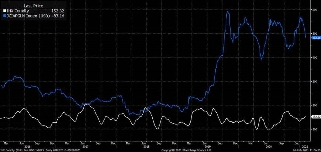 L’autre contexte demeure le fragile équilibre dans la production porcine mondiale. Ici, on parle des exportations américaines vers la Chine par exemple, mais aussi de la reprise de production en Chine pour l’année qui vient. La Chine a annoncé à plusieurs reprises qu’elle mettrait tout en œuvre pour revenir à un niveau de production comparable à 2018 dès cette année. Les analystes étaient plus prudents en prédisant ce retour en 2022 et même 2023. Malgré les vents contraires, la Chine serait en voie de réussir son pari. PAR CONTRE, dans cette course effréné de retour à la normale, l’hommerie n’est jamais bien loin et certains en ont profité pour soumettre à certaines entreprises chinoises des vaccins frauduleux contre la peste porcine africaine. Certaines maternités (entreprise New Hope Lihue) en font les frais présentement, mais l’affaire sorti au grand jour il y a 1 semaine semble maintenant étouffée. À ce scandale s’ajoute aussi le fait que Reuters rapportait que des cas de DEP et de fièvre aphteuse se sont multipliés au cours des derniers jours et des dernières semaines. D’après les experts, ce sont des épisodes de maladie relativement importants. Le prix des porcelets en Chine a presque doublé à l’intérieur de quelques semaines. Pour vous donner un exemple, dans la province de Shandong, le prix est passé de 750 yuan (octobre 2020) à 1200 yuan (février 2021). A Jiangsu, le prix a monté à 1400 yuan. Les producteurs ayant peur que la maladie entre dans leurs troupeaux ont préféré liquider leurs porcs avant leur maturité. La firme (Yongyi) qui compilent les données notait que les porcs abattus récemment atteignaient à peine un poids de 90 kilos versus les 120 à 140 kg typiquement atteints. Par conséquent, la production de porcs chinois sera-t-il freiné par ces maladies? Combien de temps le pays sera-t-il touché? Les charlatans avec leurs faux vaccins auront fait plus de dommages que prévu? Un autre cas de fièvre porcine africaine a été recensé à Yuen Long. Résultat? 240 porcs abattus par prudence.