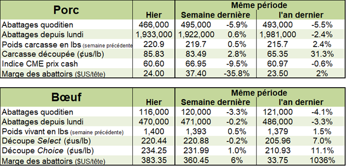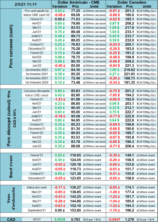 Qu’à cela ne tienne la Chine célèbrera son Nouvel An la semaine prochaine (12 février – Année du buffle de métal) et il est bien possible les choses ralentissent un peu pendant 2 semaines (moins de ventes à l’exportation viandes et grains). Il sera important de voir si le pays de Confucius augmentera les importations au cours des prochaines semaines afin de palier peut-être à une diminution de production imprévue par les autorités chinoises Le USDA a tout de même rapporté hier que la Chine avait commandé encore une fois plus de 17 900 tonnes métriques et reçu 12 000 tonnes la semaine dernière. En fait, avec des ventes totales de 46 300 tonnes métriques, les Etats-Unis ont enregistré d’excellentes ventes. Cela demeurent un élément très positif pour le maintien des prix à court terme.