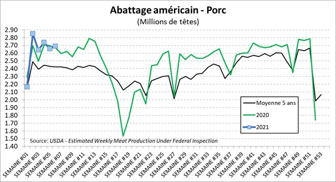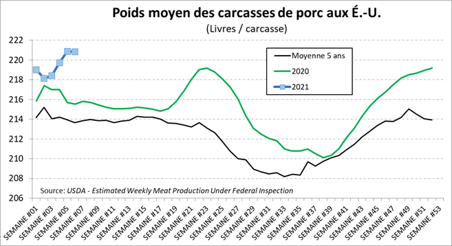 Depuis 2015, le prix de la découpe de porc est pratiquement à un sommet pour cette période de l’année, en ligne avec 2017, oscillant autour de 85 cents la livre. Pourtant, ce n’est pas l’offre de viande qui manque aux États-Unis avec des abattages à 2.70 millions de porcs la semaine dernière, à la hausse de +0.7% versus l’an dernier. Le poids continue d’être extrêmement élevé à 221 lbs/carcasse, un record. Il ne faut pas oublier qu’on ne inclue pas le poids de la tête sur la carcasse américaine, ça reviendrait donc à un poids moyen de 239 lbs/carcasse au Québec ou 108.4 kg. En somme, la production était plus élevée par +3.2% à 594.2 millions de livres.