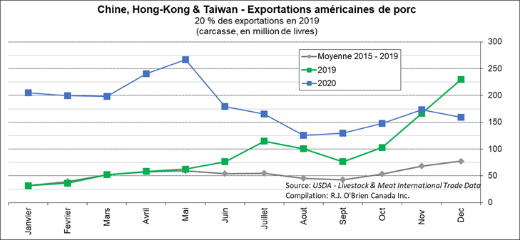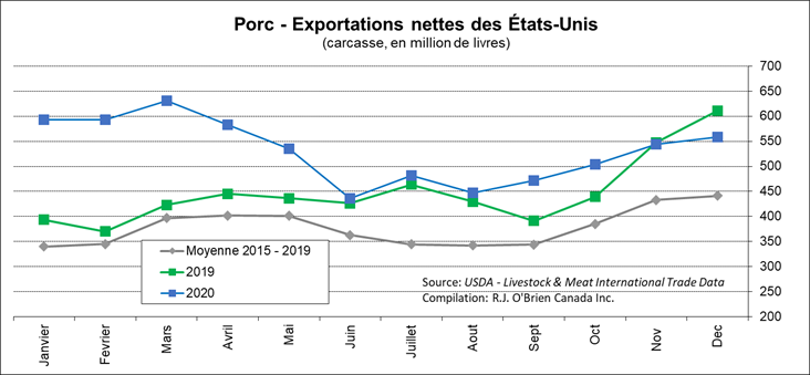 Ce matin, l’USDA publiait les exportations du mois de décembre. Ce n’est normalement pas une donnée qui fait varier les prix puisqu’ils s’est déjà passé 2 mois depuis les livraison, mais c’est tout de même intéressant de noter que les exportations de la fin 2020 étaient nettement sous les quantités de 2019. Du côté des exportations, le Mexique reprend le rang du plus gros acheteur avec 169 millions lbs, suivi de près par la Chine et ses territoires, avec 159 millions lbs. Le Japon demeure bon troisième, avec 102.5 millions lbs. Les exportations de décembre totalisaient donc 636.1 millions de livres. Du côté des importations, seul le Canada est digne de mention avec près du deux tiers du volume importé qui totalisait 77.6 millions de livres. Au final, les exportations nettes étaient de 558.5 millions lbs, c’est la première fois depuis une vingtaine de mois que les exportations affichent une décroissance notable versus l’année précédente.