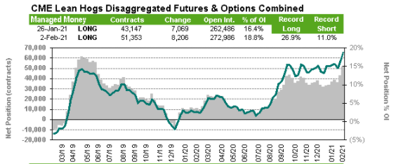 Du côté des spéculateurs, on voit qu’il n’y a pas juste Gamestop, Tesla et le Bitcoin qui captent l’attention des spéculateurs, mais aussi les marchés des matières premières et le porc n’en fait pas exception. Entre le 27 janvier et le 2 février, les spéculateurs ont ajouté 8,200 contrats d’achat à leur position existante, pour une position nette de 51,350 contrats achetés. C’est la plus grosse position depuis le printemps 2019.