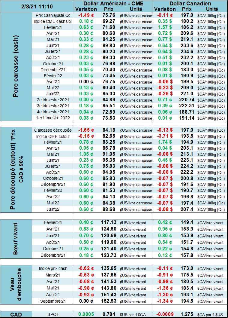 Le prix du porc monte légèrement ce matin, après une nuit mouvementée sur la bourse chinoise. Depuis l’existence du contrat à terme en Chine, le prix a connu sa plus forte augmentation cette nuit avec un gain jusqu’à 6% à certains moments, pour finir la séance avec un gain de +4.25%, à un prix équivalent à 4.16 $US/kg pour septembre 2021. La semaine dernière, on parlait déjà que la production chinoise est prise avec de nouveaux cas de PPA, DEP et fièvre aphteuse. L’ampleur des dommages est toutefois inconnue et il ne faut pas oublier que le troupeau chinois est 7x plus gros que celui des États-Unis, c’est alors difficile de quantifier l’impact de quelques cas sur la totalité d’un troupeau aussi vaste. On voit certains commentaires rapporter que 20% des truies dans le nord de la Chine seraient impacté par la nouvelle vague de PPA alors que ça serait jusqu’à 30% dans certaines région du sud. Cependant, le terme « impacté » demeure vague et il ne faut pas sauter aux conclusions trop vite. Au moins, le prix du CàT en Chine devrait refléter les anticipations du marché chinois et nous donner une meilleure idée de la situation. Puisque l’élément qui carbure la montée des prix à Chicago est en bonne partie les anticipations positives quant aux exportations américaines, il est évident que le prix des contrats en Chine sera un facteur à surveiller de près.
