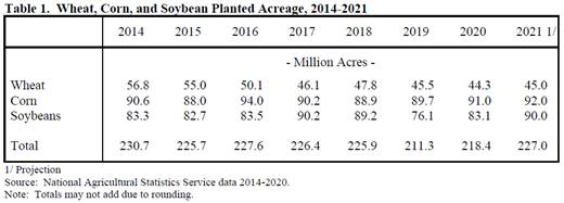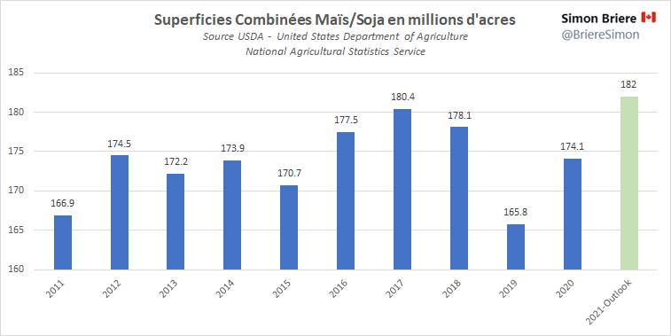 Normalement leur évaluation est assez bonne, c’est rare que les acrages bougent plus que 3% et les grandes surprises entre le Outlook et le final est une question de météo, et non de prévision économique. Dans les dernières années les producteurs ont semé un peu moins que les prévisions, probablement compte tenu de l’environnement économique de prix faible et de l’incertitude quant à la pandémie l’an dernier et des fortes pluies en 2019. Cette année les prix sont très bons, il serait à mon avis étonnant (mis à part de la météo) qu’aux USA ils en sèment beaucoup moins. Ça fait des années qu’on n’a pas eu des aussi forts prix pour la récolte à ce temps ci de l’année – normalement c’est en juin que le risqué météo est le plus élevé.